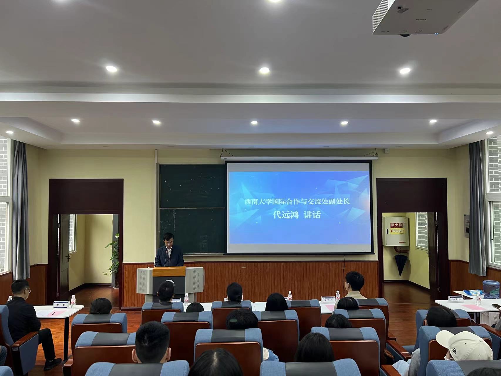扣扣传媒 国际合作与交流处代远鸿副处长代表学校对远道而来的秋令营成员表示欢迎。他向与会的泰国师生介绍了重庆及扣扣传媒 的国际化合作办学的基本情况,并表示学校与泰国孔敬大学和国光中学有着深厚的友谊和合作基础,在国际中文教育和中华优秀传统文化传播中发挥着良好作用,并希望此次来华学生能够认真学习、深入体验,全方位感知中华优秀传统文化的魅力。