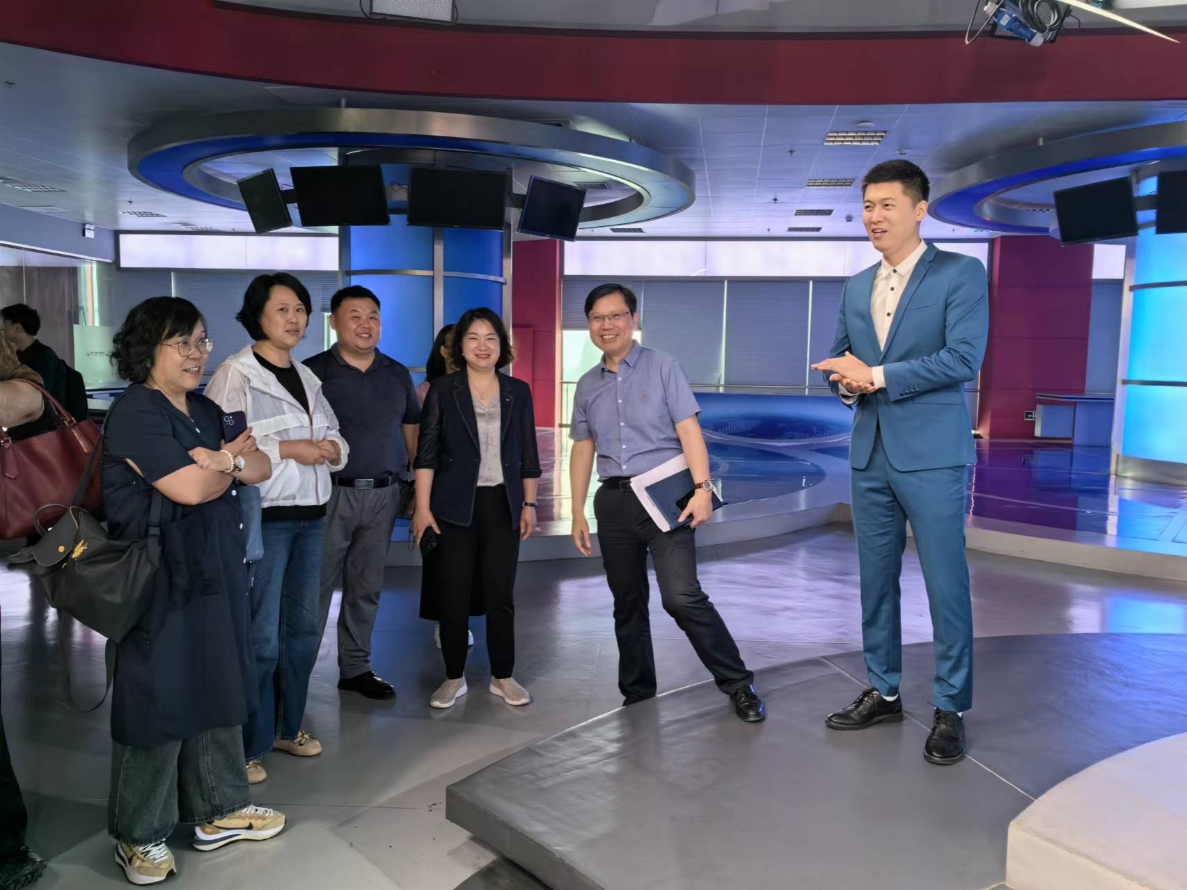 在安徽广播电视台扣扣传媒,学院一行参观了新闻1号演播厅、非编机房与《每日新闻报》演播厅。座谈中,扣扣传媒主任鄢法孺对中心业务进行了详尽介绍,并阐释了在面对行业变局中该单位如何变革新闻制作的模式。张秋丽副教授与《每日新闻报》主持人孙鹏飞在播音人才培养等方面进行了详细探讨与交流。双方还在县级融媒体中心建设、舆情研究、实习岗位与校企合作等方面进行了深入的沟通。最后,学院领导看望了在安徽广播电视台工作的校友宛月琴、吴言。