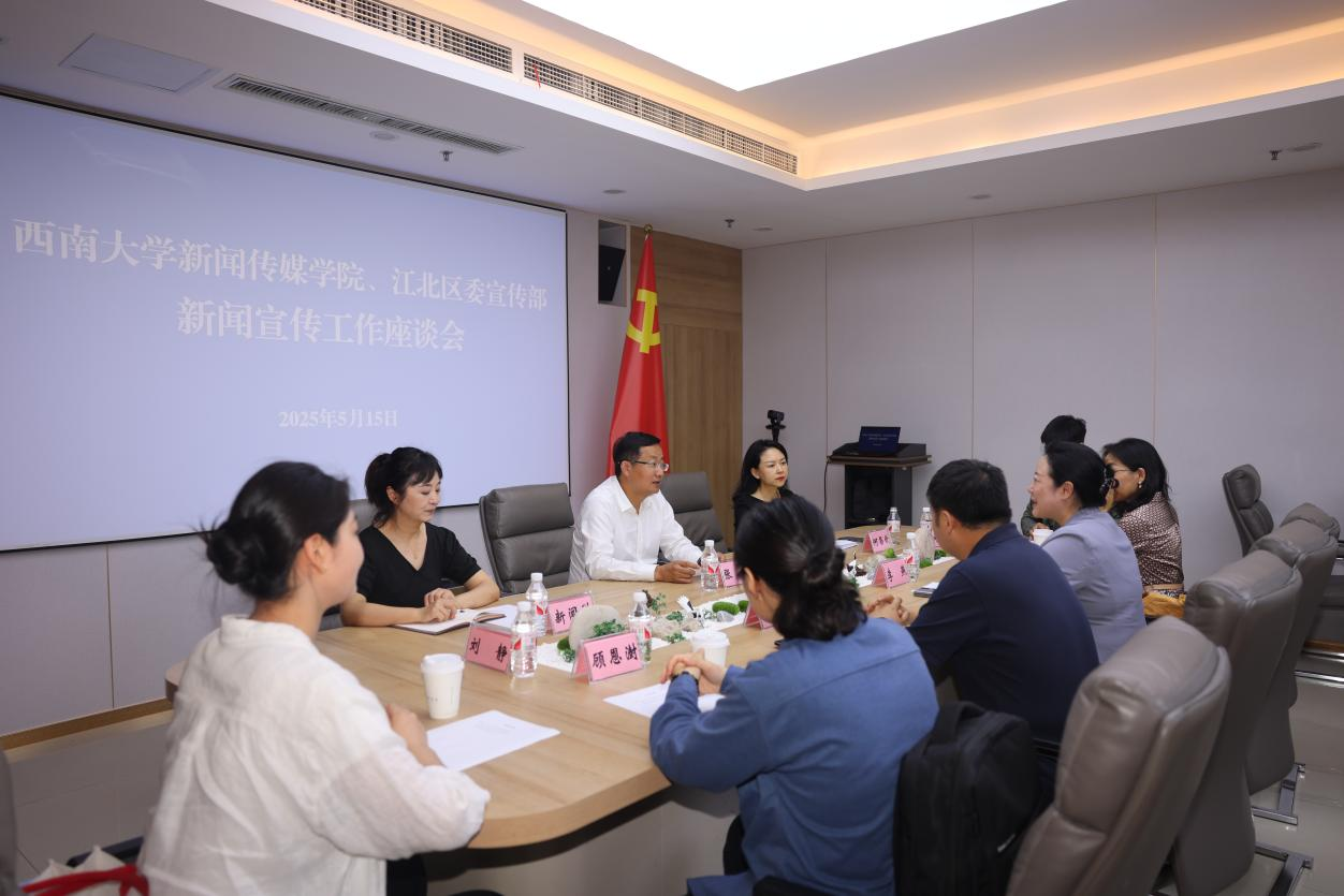 为深化校地合作,探优化高校新闻传播人才培养模式,5月15日,扣扣传媒 党委书记李燕率队前往江北区委宣传部调研交流并开展访企拓岗,学校图书馆党委副书记、纪委书记副馆长(兼)秦红雨教授、张华教授、顾恩澍老师、郭志聪老师参加。江北区宣传部常务副部长张弛等领导陪同并参加座谈交流,双方围绕新闻宣传工作实践、人才培养与就业实训等展开深入探讨。